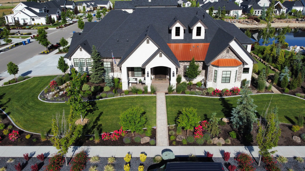 This proposed landscape design in Eagle includes updated plant material throughout the entire property, a new driveway roundabout with a 3-tier water feature, a paver walkway and retaining wall adjacent to the new addition to the house, an updated back patio and dog area, and landscape lighting around the property, which will enhance the property and provide year-round interest!